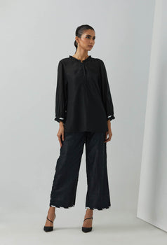 This black tunic has a ruffled neck line and long sleeves. Made from silk chanderi fabric, it's soft and comfortable. The tunic is best paired with comfortable palazzo.